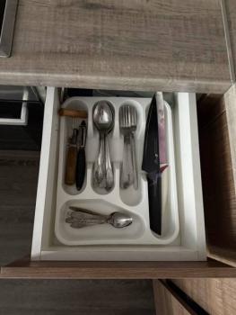 Кухонный гарнитур, с барной стойкой, очень много места для посуды (есть полные комплекты посуды, сковородки, тарелки и тд)