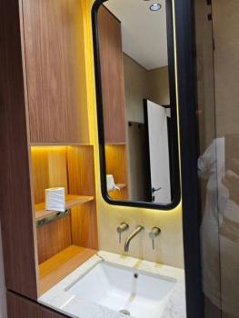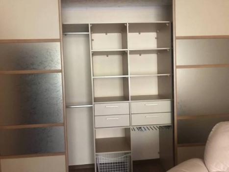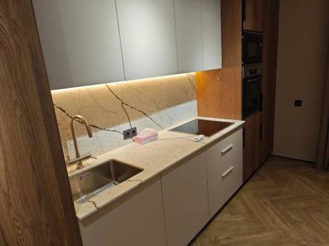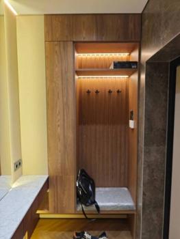 Установлена встроенная дизайнерская мебель, изготовленная под заказ, вся в единой цветовой гамме и стиле.