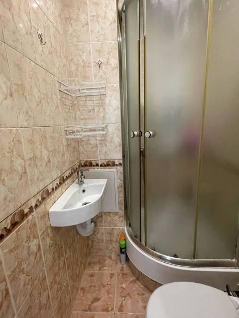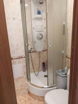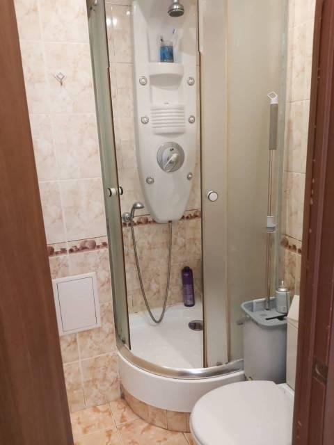 На полу ламинированный паркет, натяжные потолки, пластиковые окна, в санузле душевая кабина. Железная дверью. Без балкона.