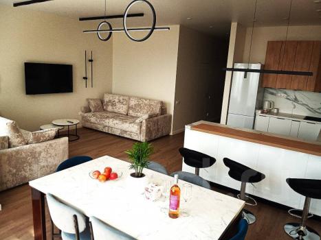 Мебель: Два встроенных шкафа в прихожей, Кухонный гарнитур, Барная стойка, Обеденный стол, Два раскладных дивана в гостиной, Кофейный столик. Спальня: Двуспальная кровать, Два двустворчатых шкафа, Две прикроватные тумбочки, ТВ-тумба. Детская: Раскладной диван, Компьютерный стол, Навесные шкафы, Комод.