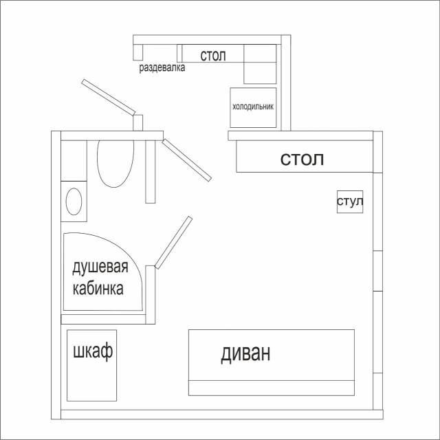 Мебель: Двуспальная кровать, Кухонный гарнитур, Обеденный стол, Два встроенных шкафа.