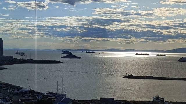 Видны: центр города, бухта Золотой Рог с вантовым мостом, остров Русский, Амурский залив.