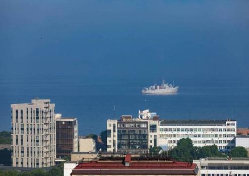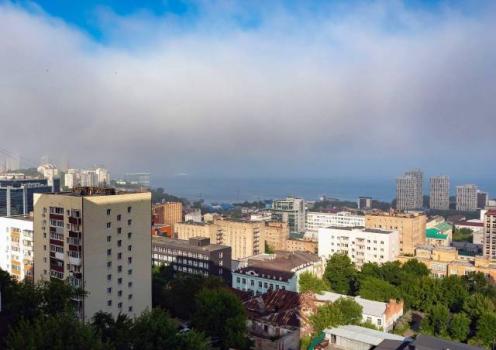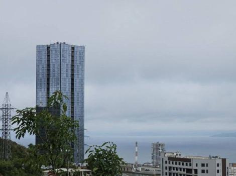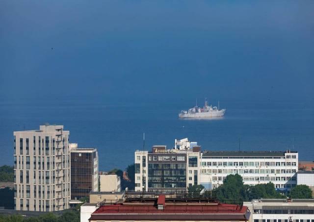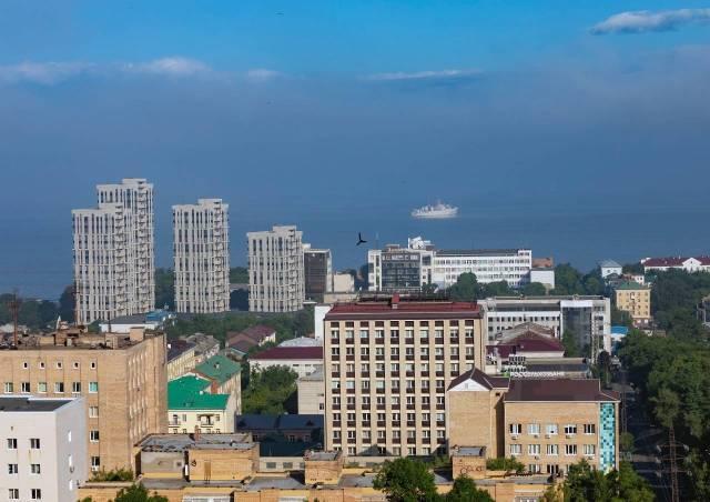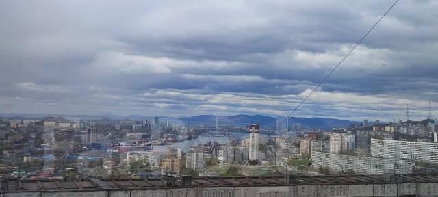 Видны: центр города, бухта Золотой Рог с вантовым мостом, остров Русский, Амурский залив.