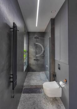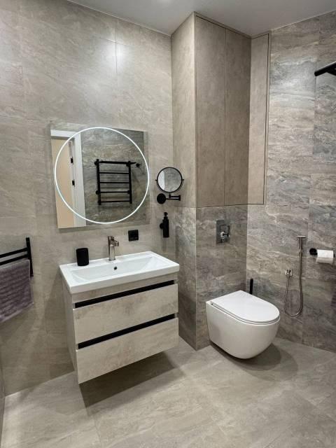 В ванной комнате на полу керамогранит с электрическим теплым полом, в комнатах- ламинат.