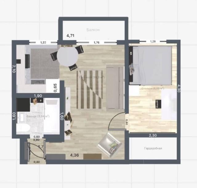 Мебель: Двуспальная кровать, Диван-кровать, Журнальный столик, Компьютерный стол, Приставной кофейный столик, Кресло, Кухонный гарнитур, Обеденный стол, Шкаф, Шкаф-купе, ТВ-тумба