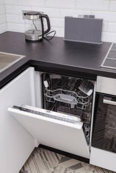 Кухонная зона с обеденным столом, который можно использовать для работы.