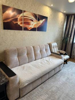 Мебель: Двуспальная кровать, 2 дивана, Кухонный гарнитур, Обеденный стол, Шкаф, Шкаф-купе, Письменный стол (трюмо), Тумба под телевизор, Табуреты, Прикроватные тумбы