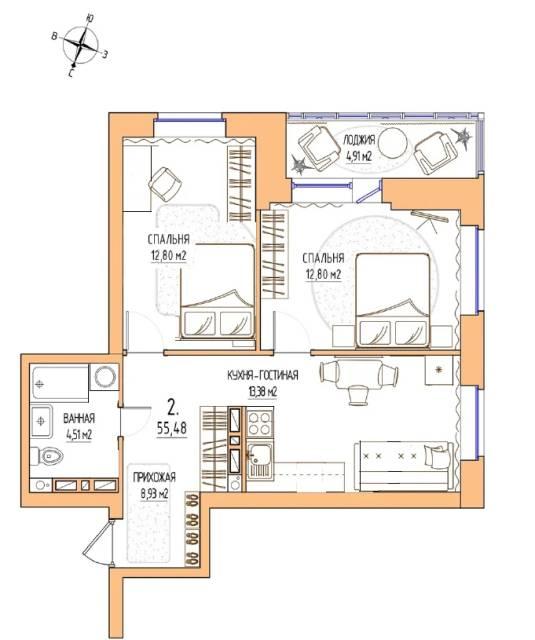 2-к квартира, 56.3 м²40 000 р.
