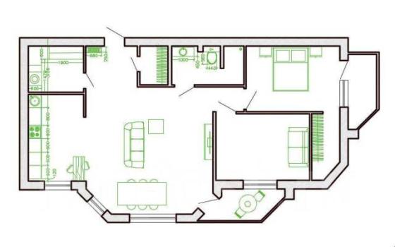 Мебель: Двуспальная кровать, Диван, Журнальный столик, Кухонный гарнитур, Обеденный стол, Шкаф, Шкаф...