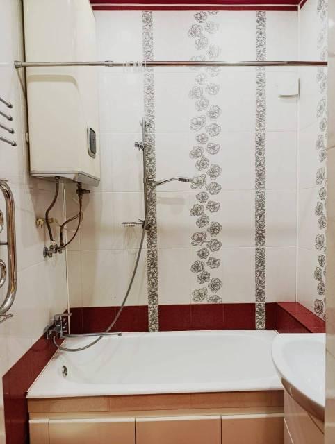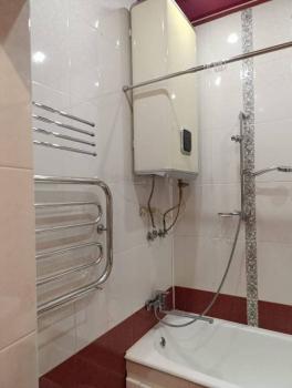 Просторная ванная комната ,большая раковина с тумбой и зеркалом, установлен водонагреватель.