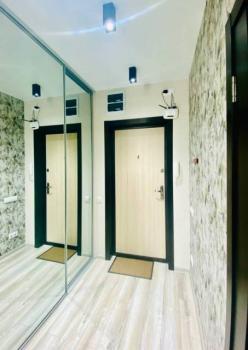 Особенности: Гардеробная, Железная дверь, Ламинат, Межкомнатные двери, Натяжной потолок, Пластиковые окна, Софиты, Стены выровнены, Тёплый пол