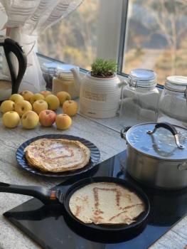 Кухонная зона полноценная, хоть и небольшая. Имеется холодильник, посуда, плита, духовка, мультиварка. Кран с чистой водой, которую можно пить.