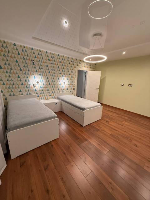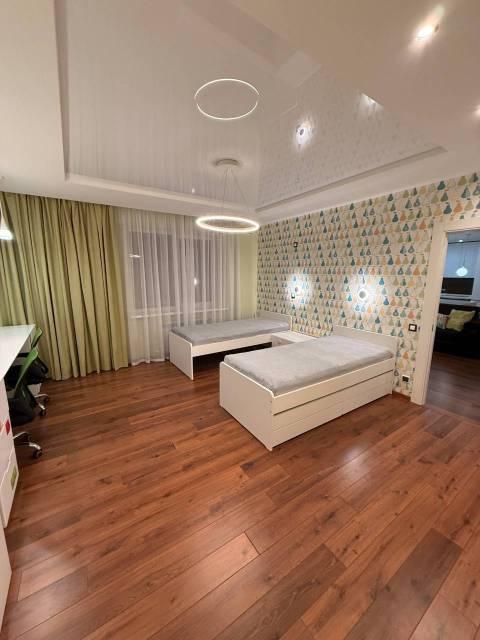 Мебель: Квартира полностью укомплектована. Есть все необходимое для комфортного и длительного проживания: двуспальная кровать, гардероб, детские кровати 2 шт., письменный стол со стульями, шкафы для детской одежды, раскладывающийся диван, кухонный гарнитур, обеденный стол, шкаф-купе.
