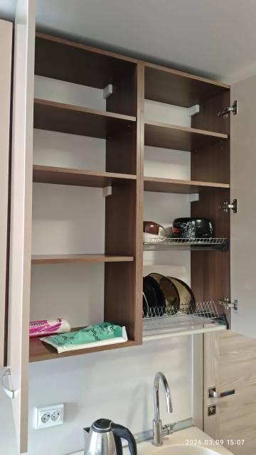 Техника: Вытяжка, Стеклокерамическая варочная поверхность, Духовой шкаф, Холодильник, Микроволновая печь, Стиральная машина, Водонагреватель., Титан, Стеклокерамическая плита