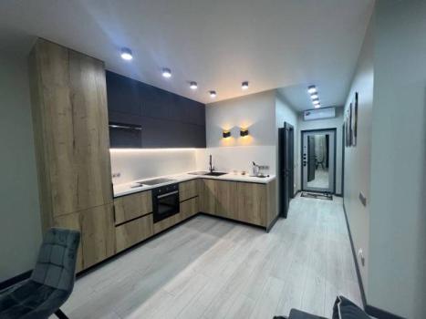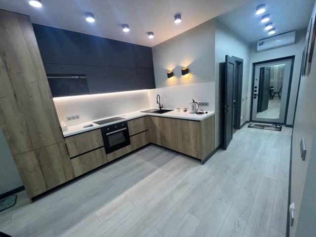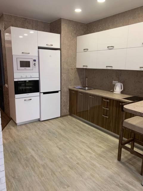 Зона кухни, полностью оборудованная под нужды современного человека, а именно, стеклокерамическая плита, духовой шкаф, вытяжка, холодильник, микроволновая печь .