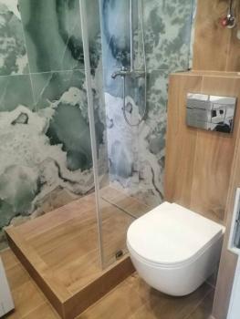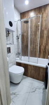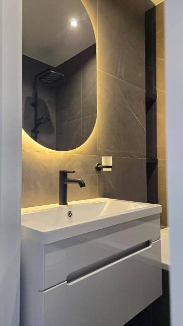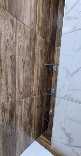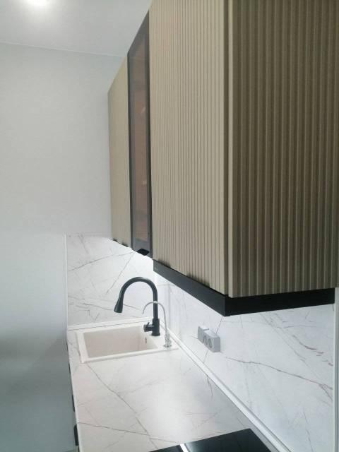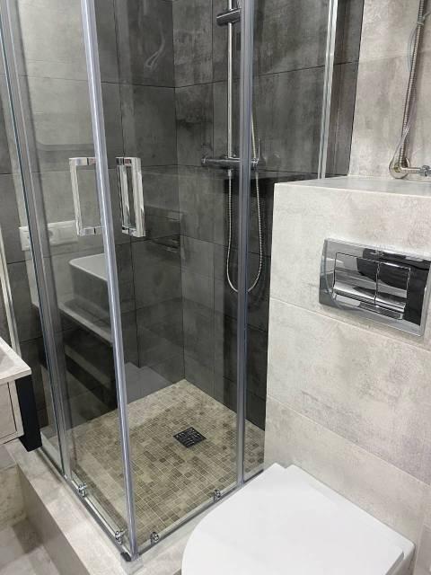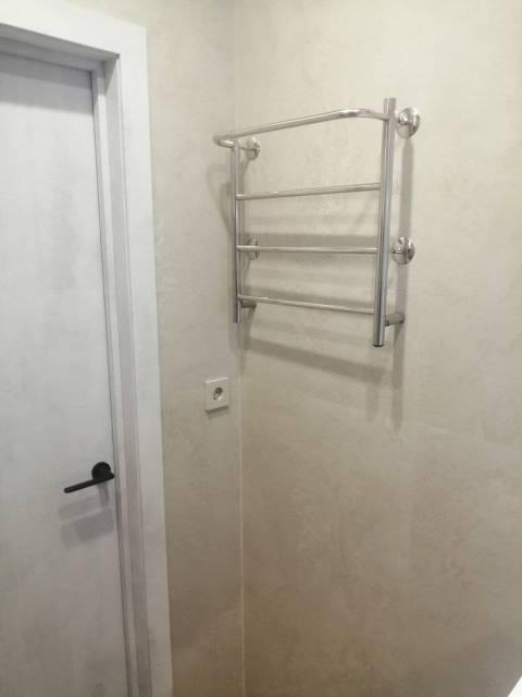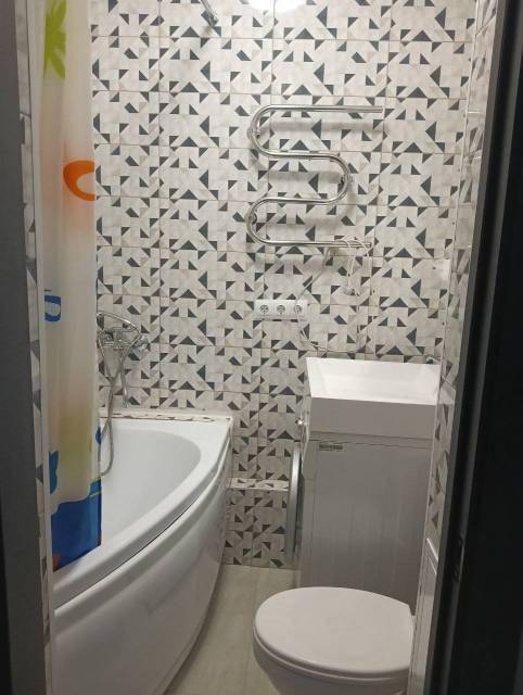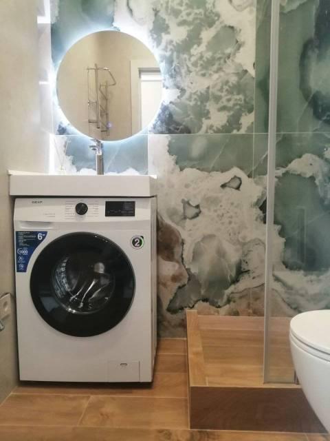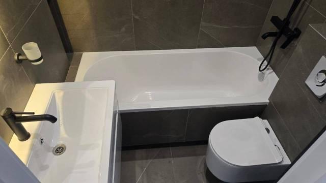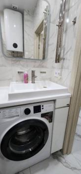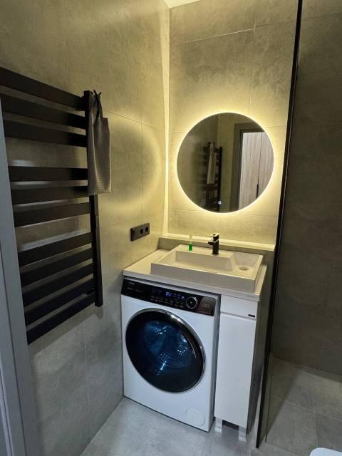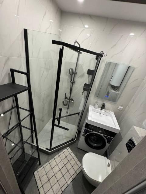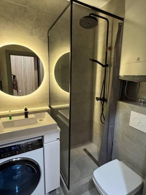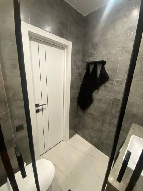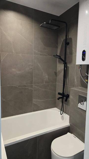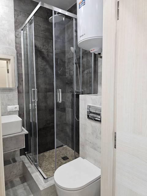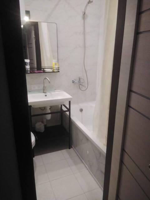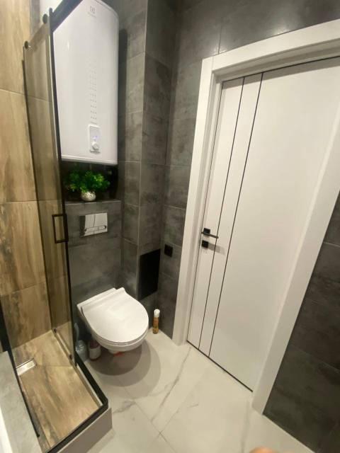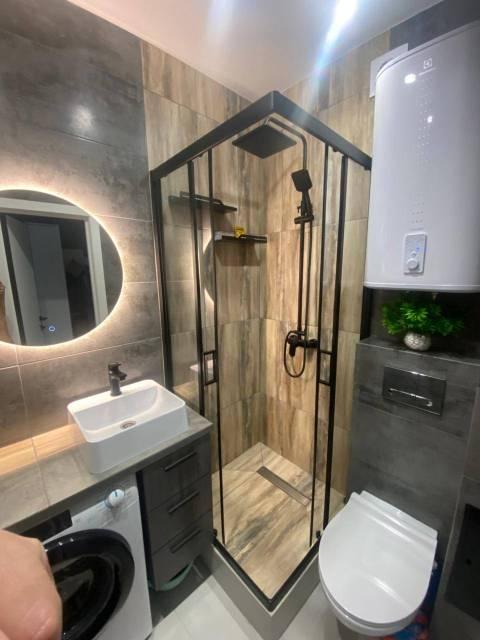 В Квартира современная качественная отделка: широкоформатный керамогранит в су, подвесной унитаз, нагреватель 50 литров, сантехника из акрилового камня.