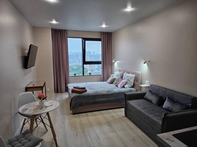 Особенности: Cдаю студию в новом ЖК "Атмосфера" с видом на город и залив Золотой Рог от 3 х месяцев. Иностранным гражданам не сдается, также запрещены: увеселительные мероприятия с присутствием посторонних, субаренда, животные, курение. Предварительный просмотр по договоренности, заключение договора. При выезде постояльцы обязательно прибирают квартиру.