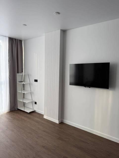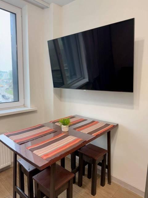 Кондиционер, угловой раскладной диван, телевизор со смарт ТВ, робот-пылесос.
