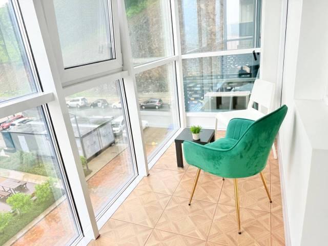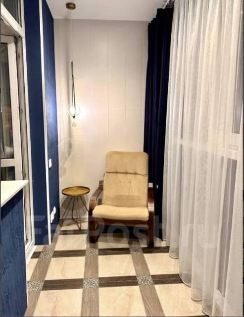 Большой балкон с панорамным остеклением укомплектован удобными стульями и столиком для приятного времяпрепровождения, где можно любоваться видами на море, сопки и город.