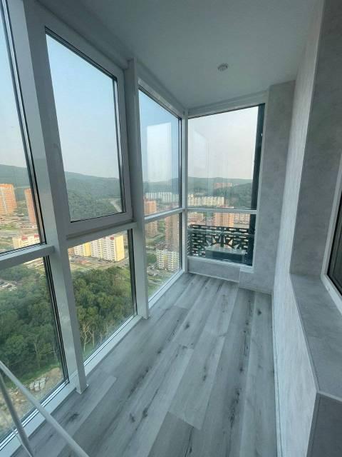 Шикарный балкон с панорамным остеклением и видом на море, сопки и город.