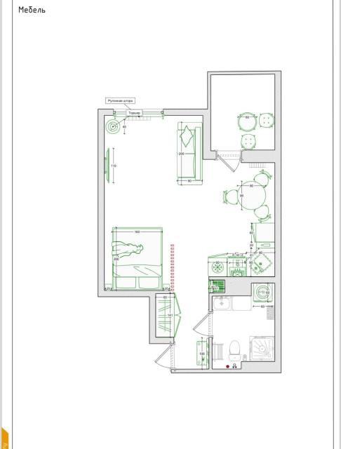 Мебель: Двуспальная кровать, Диван, Журнальный столик, Кухонный гарнитур, Обеденный стол, Шкаф