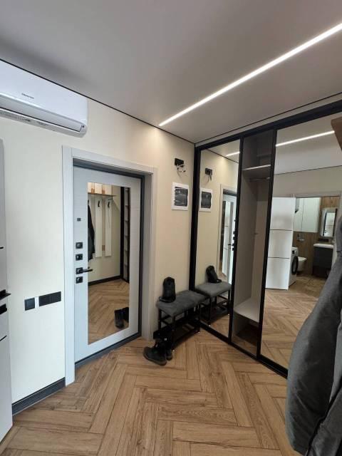 Особенности: Гардеробная, Железная дверь, Ламинат, Межкомнатные двери, Натяжной потолок, Пластиковые окна, Софиты, Стены выровнены, Тёплый пол