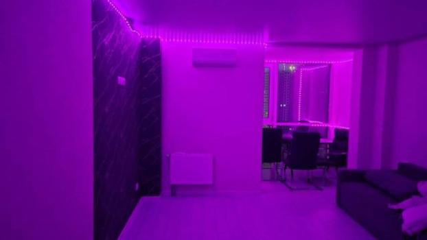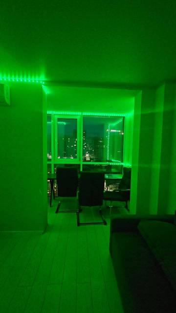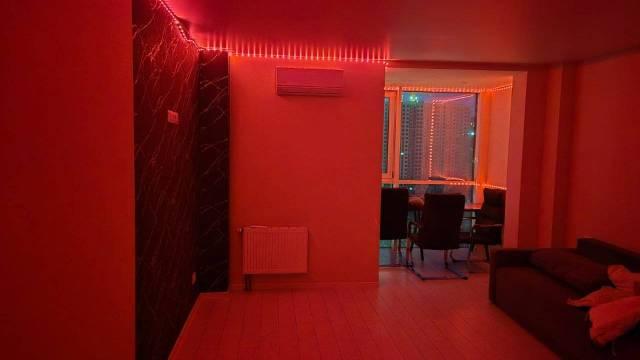 Квартира оборудована тёплым полом. В прихожей, ванной и балконе установлен красивый керамогранит, в комнате постелен качественный ламинат. По периметру квартиры натяжные потолки с софитами.,