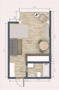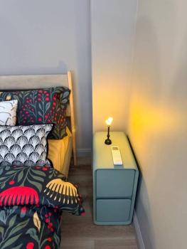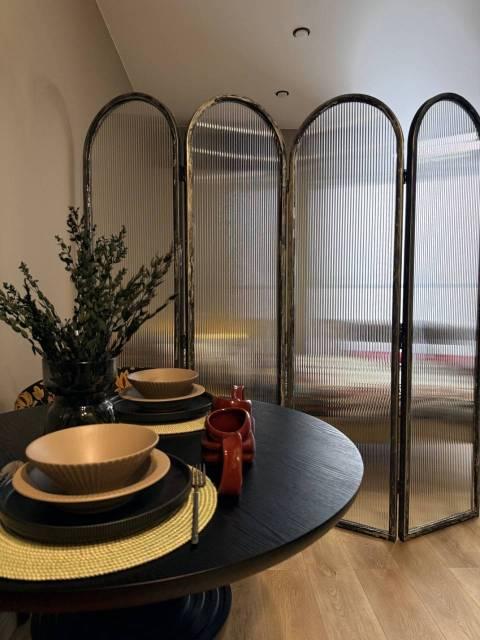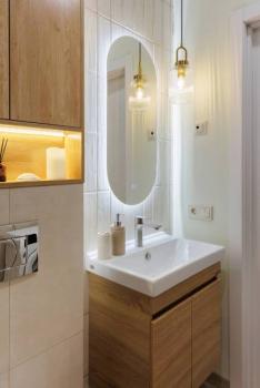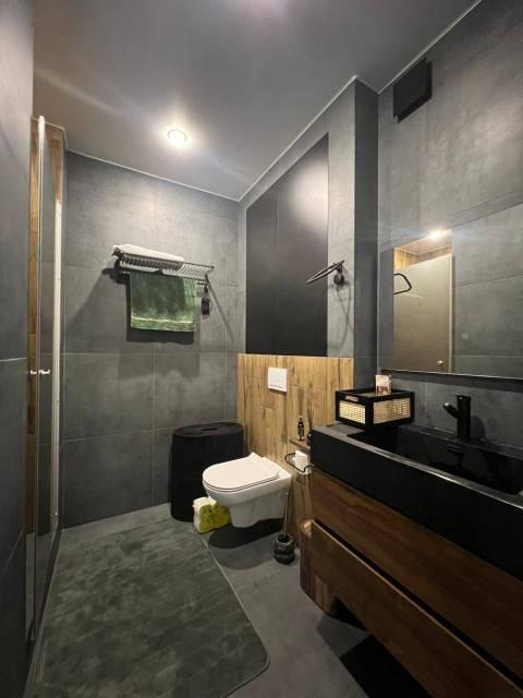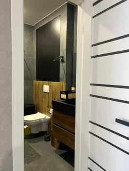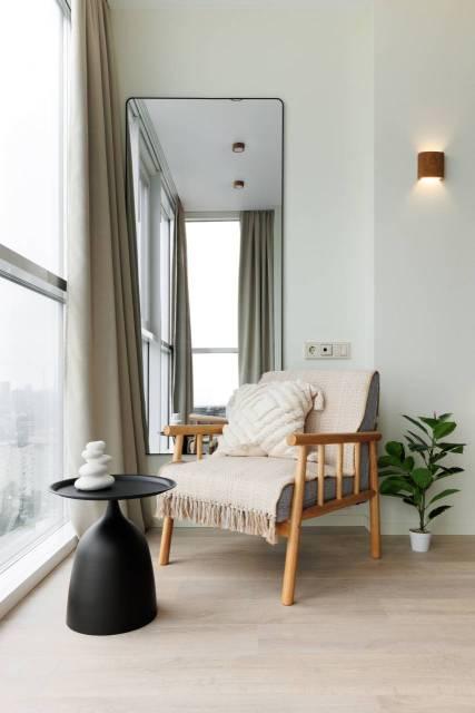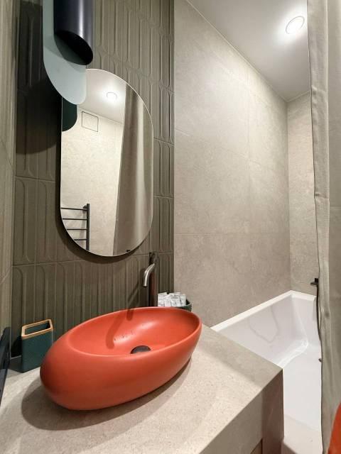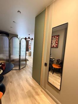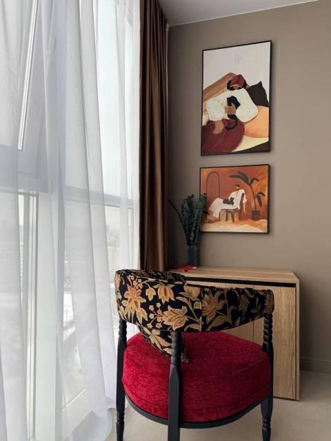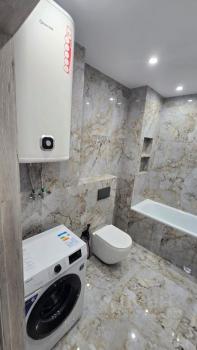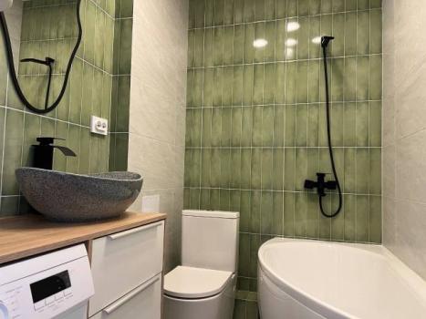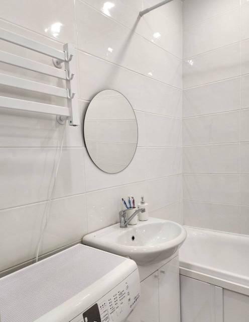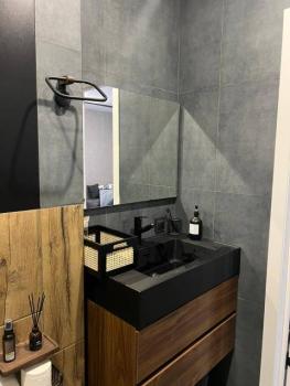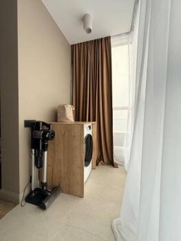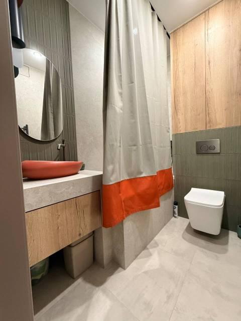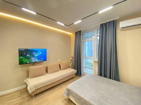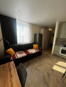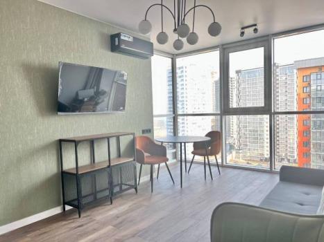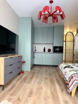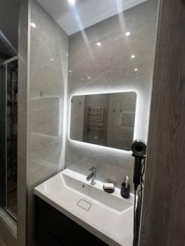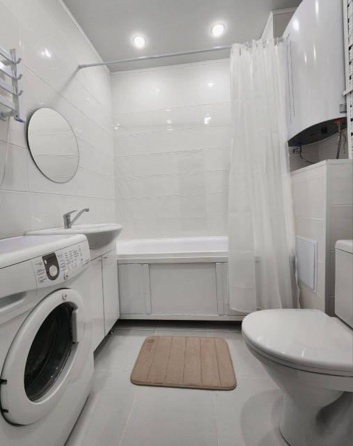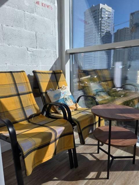 Мебель: В квартире есть все для комфортного проживания: кухонный гарнитур, обеденный стол, стулья, встроенный шкаф, два комода, диван-кровать, двуспальная кровать, кресло, журнальные столики, большие зеркала, светонепроницаемые блэкаут шторы. В санузле: ванна, душевая система с тропическим душем, подвесной унитаз, подвесная раковина.