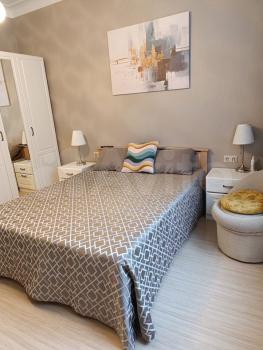 Кухня оборудована всем необходимым (посуда, столовые приборы), а ванная комната оснащена сантехникой и душевой системой. В квартире есть вся необходимая мебель и техника для комфортного проживания: