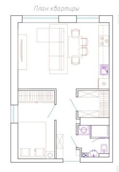 Мебель: Двуспальная кровать, Диван, Журнальный столик, Кухонный гарнитур, Обеденный стол, Шкаф в прихожей, Шкаф в спальной зоне, Стулья, Пуфик.