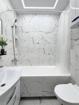 Железная дверь, Натяжной потолок,, Ламинат, Пластиковые окна, Софиты, Стены выровнены, Тёплый пол в ванной
