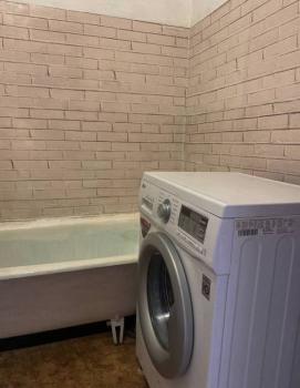 В ванной: ванна, раковина, зеркало, стиральная машина LG.