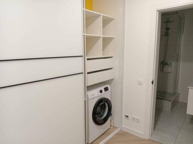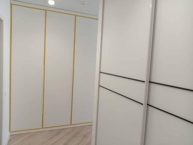 Диван двуспальный + пледы, ТВ столик, Встраиваемая кухня, Обеденный стол + стулья, Шкаф-купе в каждой комнате, подвесная тумба в ванной. Сушилка потолочная на балконе.
