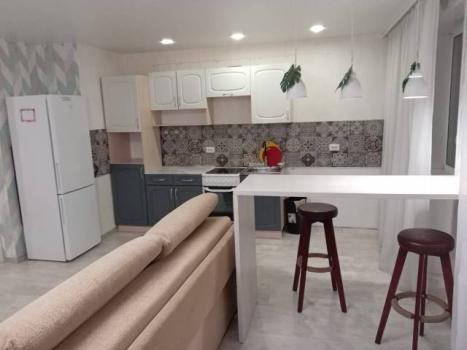 Мебель: Кухонный гарнитур. Барная стойка. Диван. Кровать. Шкаф купе в коридоре. Шкаф в спальне.