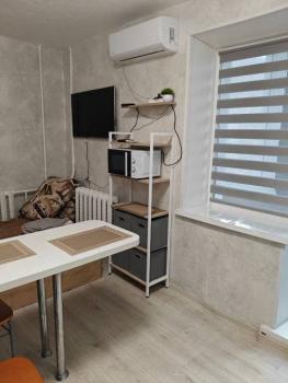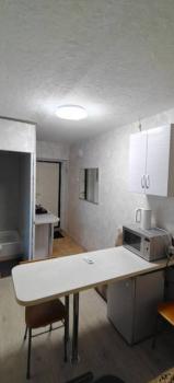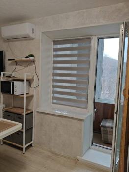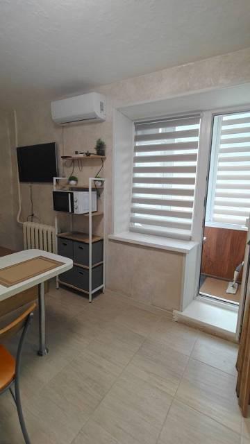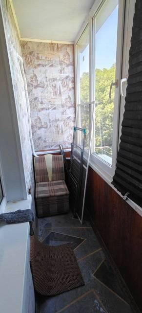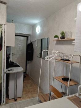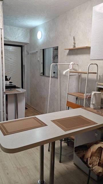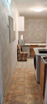 Мебель: Шкаф-купе новый с зеркалами. Журнальный столик на колесиках. Диван раздвижной. Кухонный стол и навесной шкаф. Стул. Обувная полка с сиденьем. Раздвижная сушилка для белья за окном.