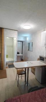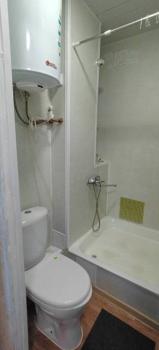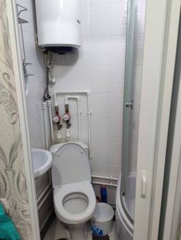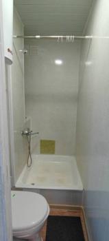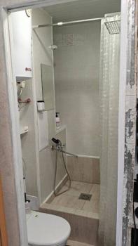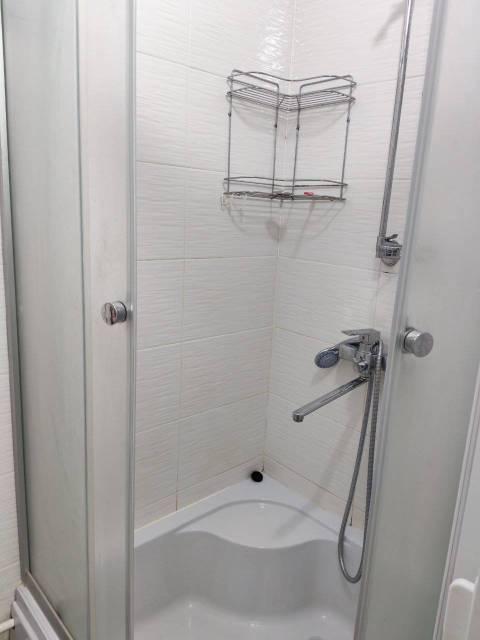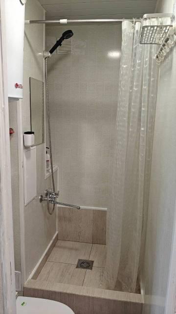Сделан ремонт , на полу везде кафель и душевое ограждение .