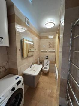 Санузел 2,5 кв.м – керамогранит под дерево/матовая плитка, чугунная ванная максимального размера, стиральная машина LG, водонагреватель 100л, смеситель Grohe, душевой - swess, большой шкафчик «под дерево» с плиткой, так же большой шкаф под раковиной, несколько источников света, вытяжка, электрический змеевик-обогреватель.