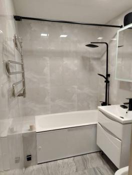 Особенности: Ремонт в квартире делали в прошлом году. Сняты деревянные полы, уложен новый ламинат. Новая электрика. Новый натяжной потолок. Увеличенная площадь ванной комнаты. Новый кафель. Заменена вся сантехника ( ванна, унитаз, раковина) Совмещена кухня с залом Новые межкомнатные двери и входная дверь. Пластиковые окна, Стены выровнены, окрашены. Квартира сдаётся в аренду впервые.