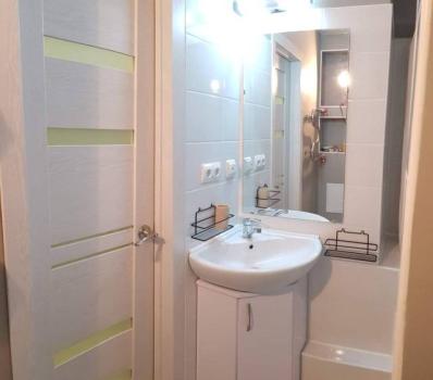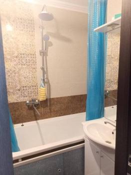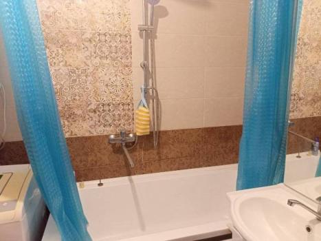 Керамогранит в ванной комнате. Установлена качественная сантехника. Застекленный балкон с прекрасным видом.