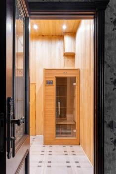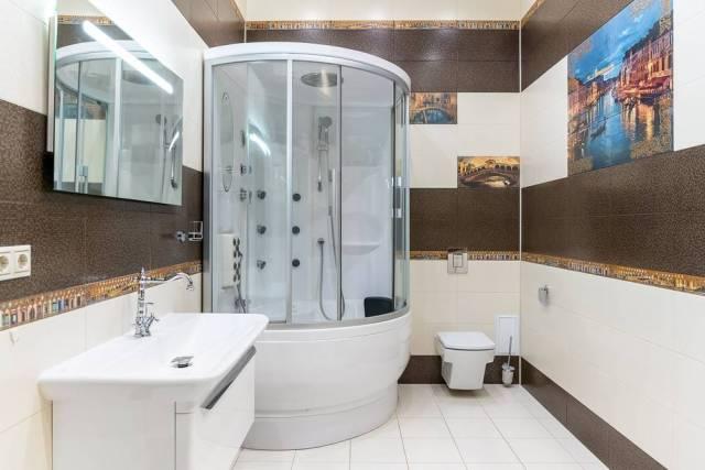 4 . Сан.узел: душевая кабина и ванна, стиральная машина, водонагреватель, полотенца, туалетные принадлежности, халаты, тапочки.