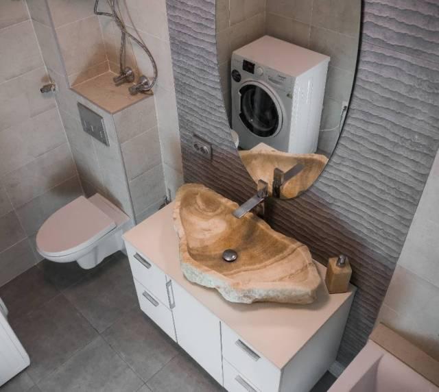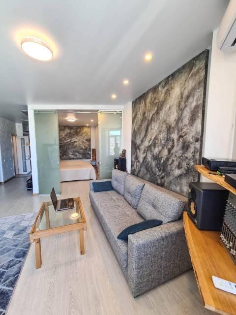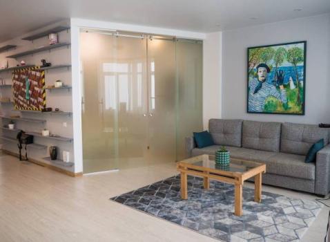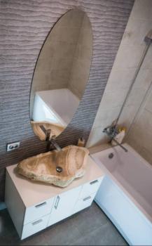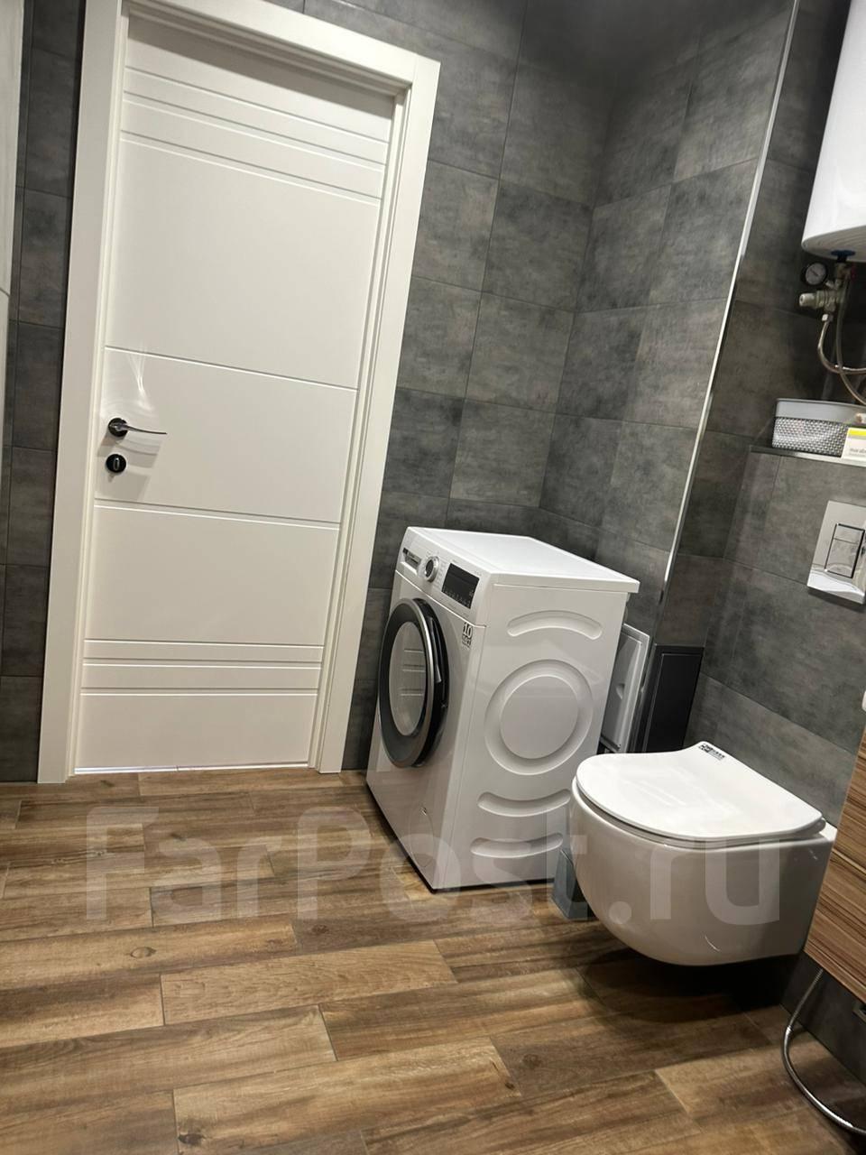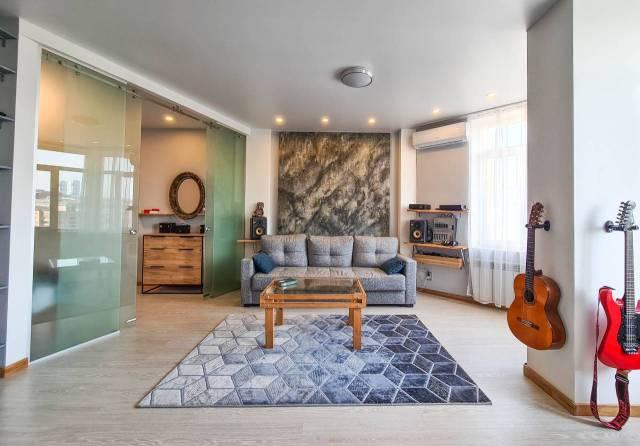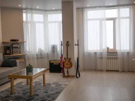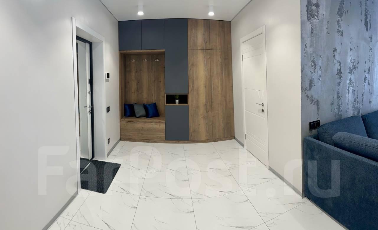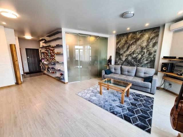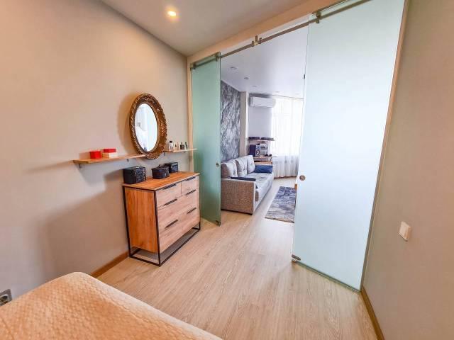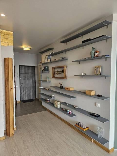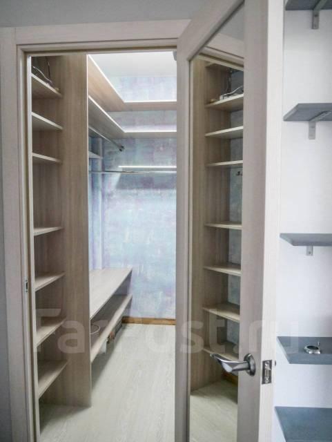 Особенности: Гардеробная, Железная дверь, Ламинат, Межкомнатные двери, Натяжной потолок, Пластиковые окна, Софиты, Стены выровнены, Тёплый пол в ванной, Стеклянная перегородка