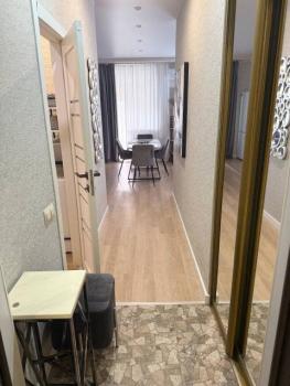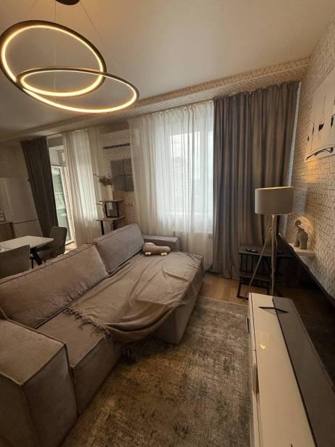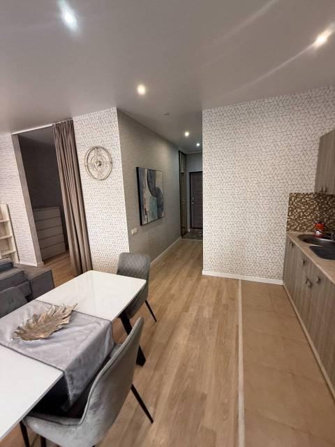 Функциональная планировка квартиры подойдет как для для одного человека, так и для семейной пары. Просторная гостиная зона, объединенная с кухней; уютная спальная комната с гардеробом; лаунж-зона с панорамным остеклением, где можно просто расслабиться и насладиться прекрасным видом на город; выделенная входная группа. Интерьер в квартире оформлен согласно образу жизни современного человека, учитывая личный комфорт и уют, поэтому проживать в такой квартире одно удовольствие.