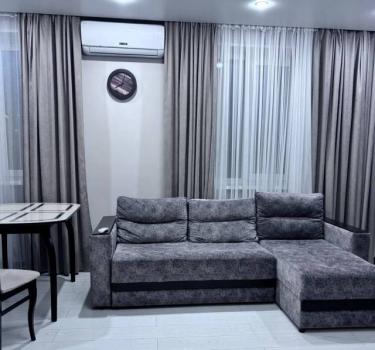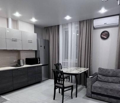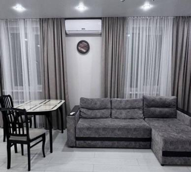 Мебель: Квартира по дизайн-проекту . Состоит из гостиной, сан-комнаты ( с душевой кабиной) , прихожей и гардеробной комнаты . Вид во двор . Южная сторона. Укомплектована мебелью. Диван раскладывается . Удобный , мягкий . Компьютерный стол, Кухонный гарнитур, Обеденный стол, стулья . Шкаф. Тёплый пол . Материалы ремонта европейского качества .