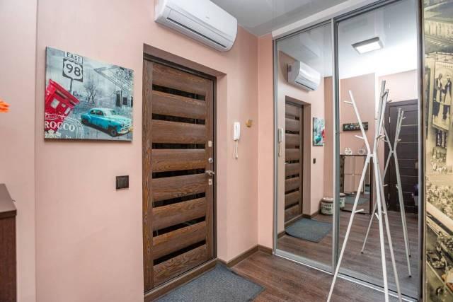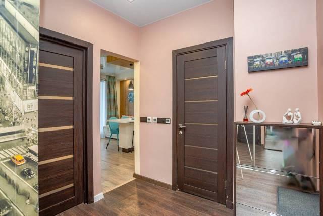 Особенности: Квартира с новым ремонтом, Балкон, Балкон застеклён, Гардеробная, Железная дверь, Ламинат, Лоджия, Межкомнатные двери, Натяжной потолок, Пластиковые окна, Софиты, Стены выровнены, Тёплый пол