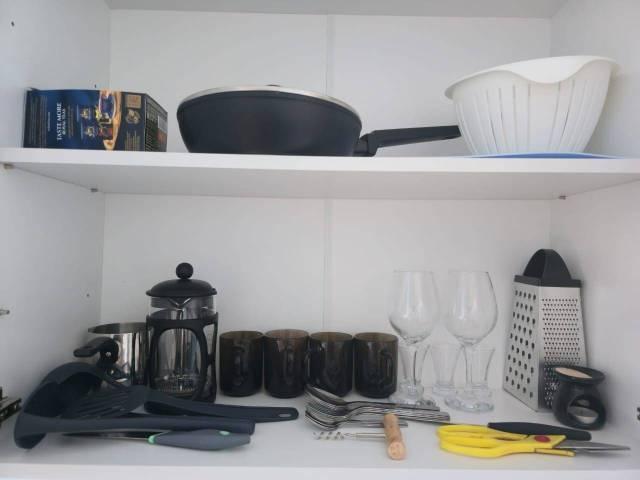 Мебель: Двуспальная кровать, косметический столик, Диван, Кухонный гарнитур, Обеденный стол,