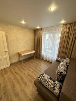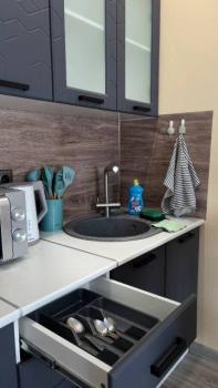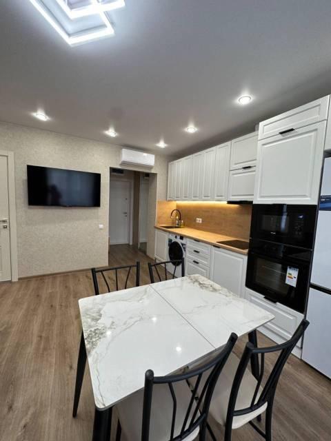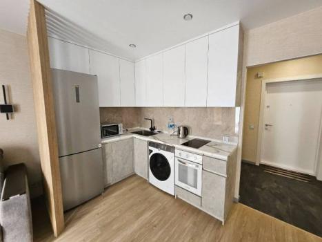 Квартира оснащена всем необходимым для проживания ,имеется гардеробная для хранения вещей . Квартира очень солнечная ,на окнах шторы -блэкаут .Кухня с обеденной зоной ,оборудованная встроенной бытовой техникой (вытяжка,духовой шкаф,микроволновая печь ,варочная панель ) ,холодильник и стиральная машина -автомат .
