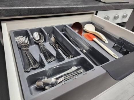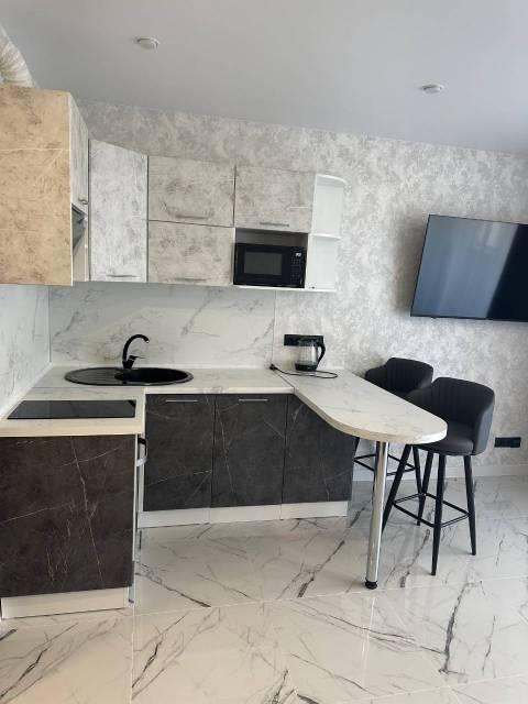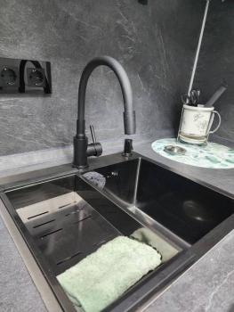 На кухне установлен хороший двурычажный кран с возможностью подключения питьевой воды, скрытая розетка. Есть все необходимые кухонные принадлежности, посуда, кастрюли и сковороды, а также постельные принадлежности. Шторы блэк-аут. Окна выходят на юго-запад, вид на лесной массив, частично на город, видно море.