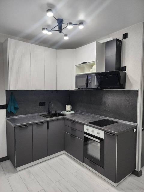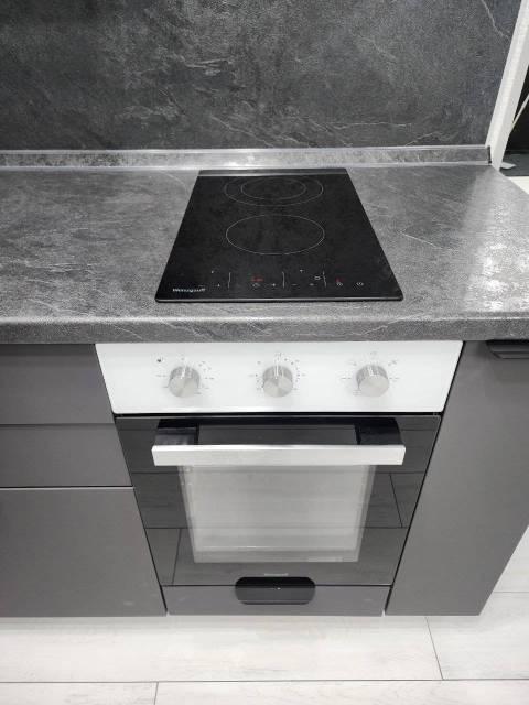 Техника: Холодильник, Вытяжка, Стеклокерамическая плита, Микроволновка, Чайник, Блендер.
