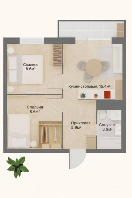 • Планировка: кухня-гостиная + 2 спальни