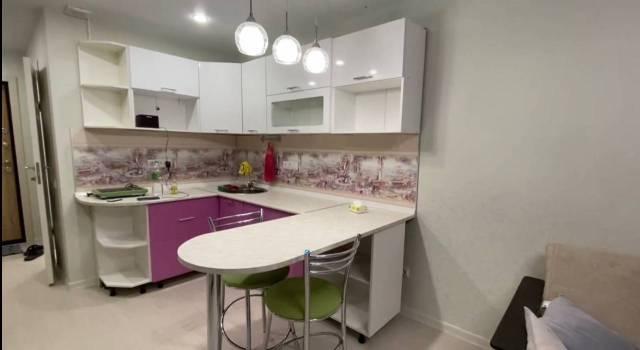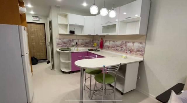 Мебель: Кухонно-обеденная зона с барными стульями, вместительный шкаф-купе, двуспальный диван.